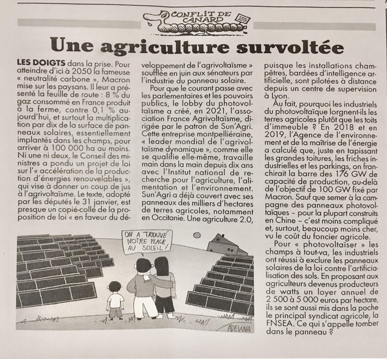 Les énergéticiens du photovoltaïque tentent-ils de profiter des difficultés du secteur agricole pour augmenter leurs profits ? C’est la crainte que nous avons. En Dordogne une 100aine de projets sont déjà en cours. L’article du Canard Enchainé du 8 Février 2023 nous en dit plus.
